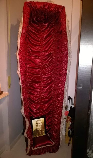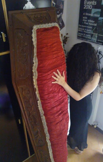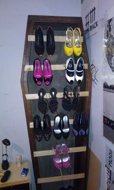 Ad esempio, ho delle amiche con cui il passatempo preferito di una lontana estate è stato farci un book fotografico, a turno, distese dentro una bara, inscenando il sonno eterno. (Sì, la mia amica C., come da foto qui sotto, nella sua camera da letto detiene orgogliosamente una bara. Da quando non la usa più per intrattenere le sue ospiti, l’ha riadattata come scarpiera, in onore di un’illustre collezione di tacchi alti). Avevamo anche i cartellini da obitorio con nome e cognome, da appenderci al piede. Voilà l’apotropaico.